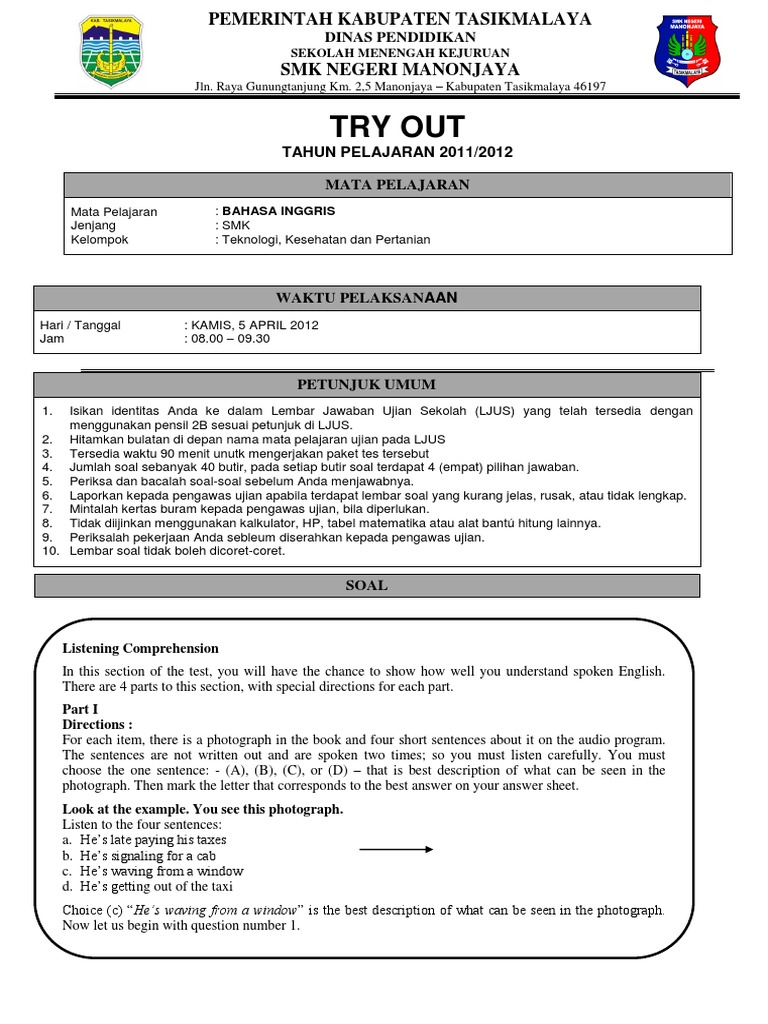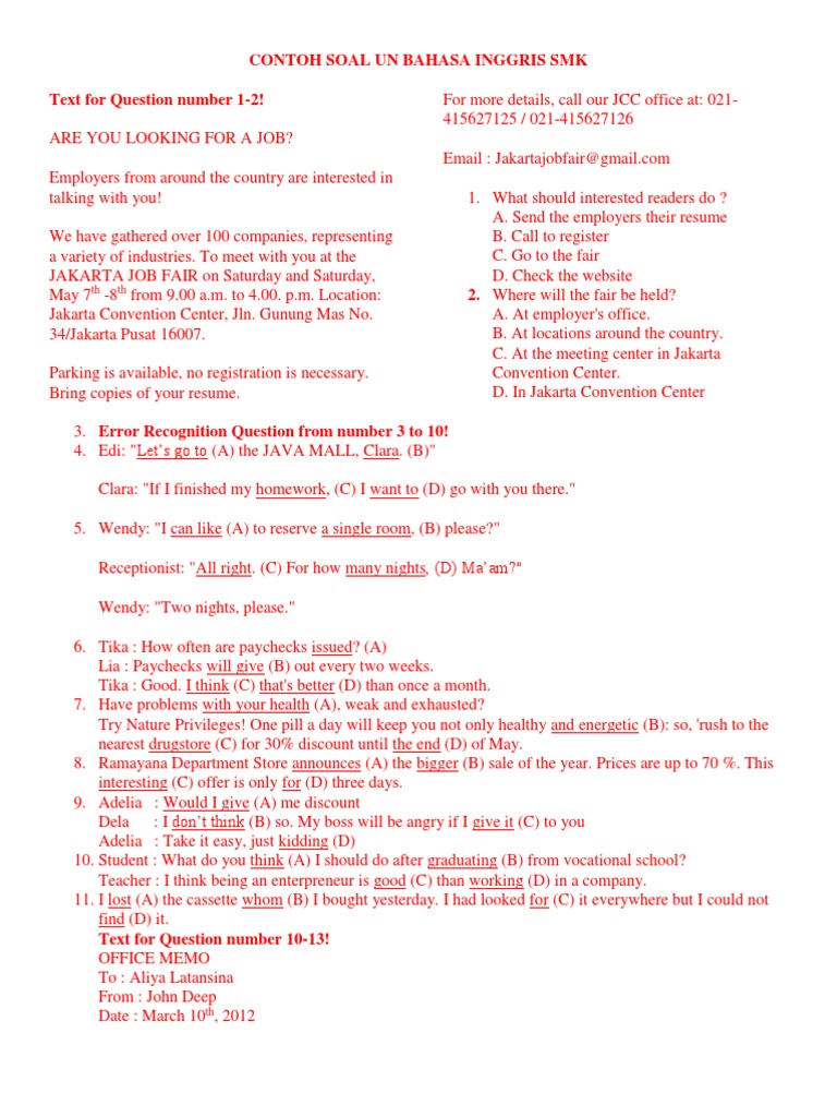 Contoh soal uas berikut terdiri dari berbagai pertanyaan yang diambil dari materi kelas 11 seperti talking about hobby and interest, question tag, gerund, taking a simple telepone. Selama beberapa tahun terakhir, soal ujian nasional bahasa inggris sma smk didominasi oleh soal yang menguji kemampuan peserta ujian. Berikut ini contoh latihan soal ujian mata pelajaran bahasa inggris untuk tingkat sma/smk kelas 12 terbaru tahun ajaran 2017/2018. Jika ingin melihat contoh soal (transcript) listening berikut, silahkan klik pada link yang ada dikolom paling bawah postingan ini. Berikut contoh latihan online soal ujian sekolah (us) atau ujian akhir sekolah (uas) bahasa innggris smk tahun 2021 tahun pelajaran 2020/2021. Namun harus undur diri dari dunia mengajar karena harus.