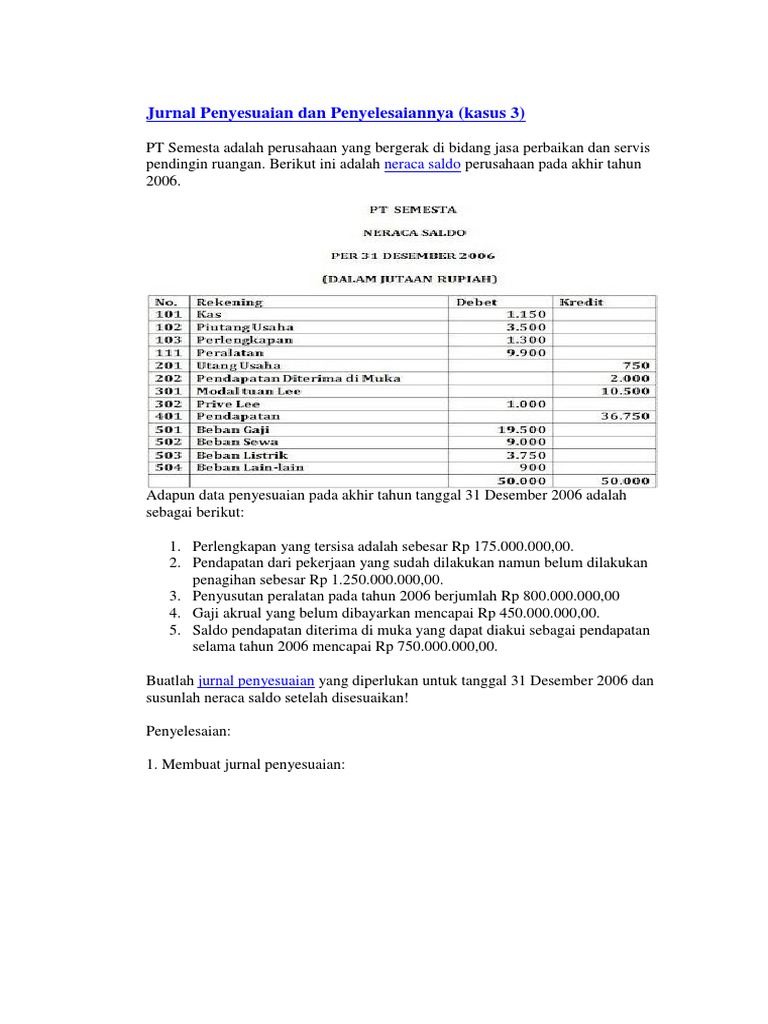 11 Contoh Soal Ayat Jurnal Penyesuaian Perusahaan Jasa Dan Jawabannya. Tahapan selanjutnya setelah pembuatan buku besar akuntansi dan neraca saldo sebelum penyesuaian adalah membuat jurnal penyesuaian. Pada akhir periode akuntansi, banyak saldo akun di buku besar yang dapat. Jurnal penyesuaian perusahaan dagang dan jurnal penyesuaian perusahaan jasa dibuat pada akhir periode akuntansi. Documents similar to contoh soal dan jawaban jurnal penyesuaian.